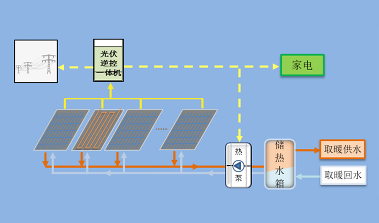 PVT組件在吸收太陽能轉(zhuǎn)化成電能的同時,也釋放大量的熱能,而組件背部的集熱板則將這部分熱量輸送給熱泵主機,熱泵主機則可以給室內(nèi)提供生活熱水或者采暖,同時產(chǎn)生的電能驅(qū)動熱泵主機,做到自給自足。